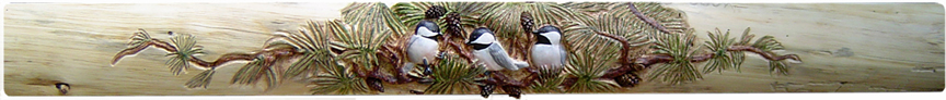 010 Chickadees Log Mantel with Pine Cones